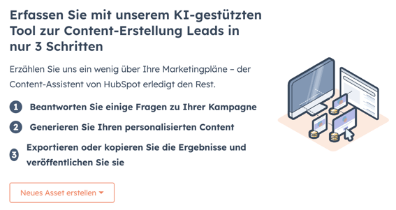 Der Kampagnenassistent von HubSpot ist ein KI-gestütztes Tool, mit dem Sie Texte für Landingpages, Marketing-E-Mails oder Anzeigen für Ihre nächste Marketingkampagne erstellen können. Sie geben Informationen zu Ihrer Kampagne an, wählen einen Tonfall, der zu Ihrer Marke passt, und geben an, welche Art von Text Sie generieren möchten. Das Tool erstellt Ihnen daraufhin je nach Auswahl den Text für Ihre Landingpage, E-Mail oder Anzeige.