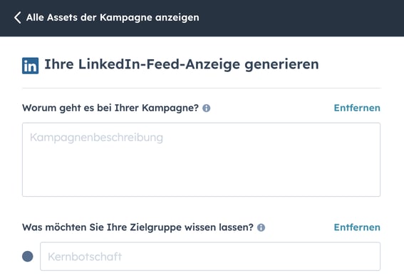 Verbessern Sie Ihre LinkedIn-Anzeigenkampagnen mit unserem Kampagnenassistenten, der speziell dafür entwickelt wurde, Ihr Marketing effizienter zu gestalten. Mit dem kostenlosen KI-Generator für LinkedIn-Anzeigentexte von HubSpot arbeiten Sie effektiver: Nutzen Sie die Möglichkeiten künstlicher Intelligenz zum Erstellen überzeugender LinkedIn-Ads und reduzieren Sie den Zeit- und Ressourcenbedarf im Vergleich zu traditionellen Copywriting-Methoden.