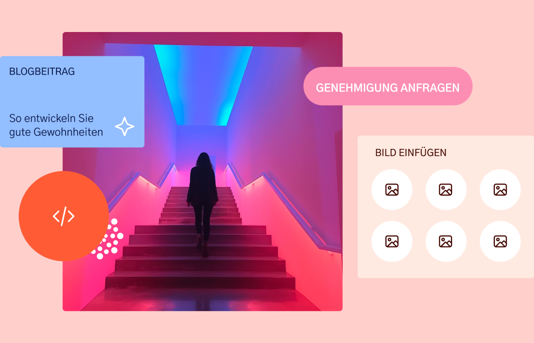 Erstellen Sie mit Content-Einbettung dynamische, plattformübergreifende Inhalte, verwalten Sie den Zugriff von Interessengruppen mit Content-Genehmigung und optimieren Sie die Bereitstellung mithilfe der Content-Bibliothek und exklusiven Blogs.
