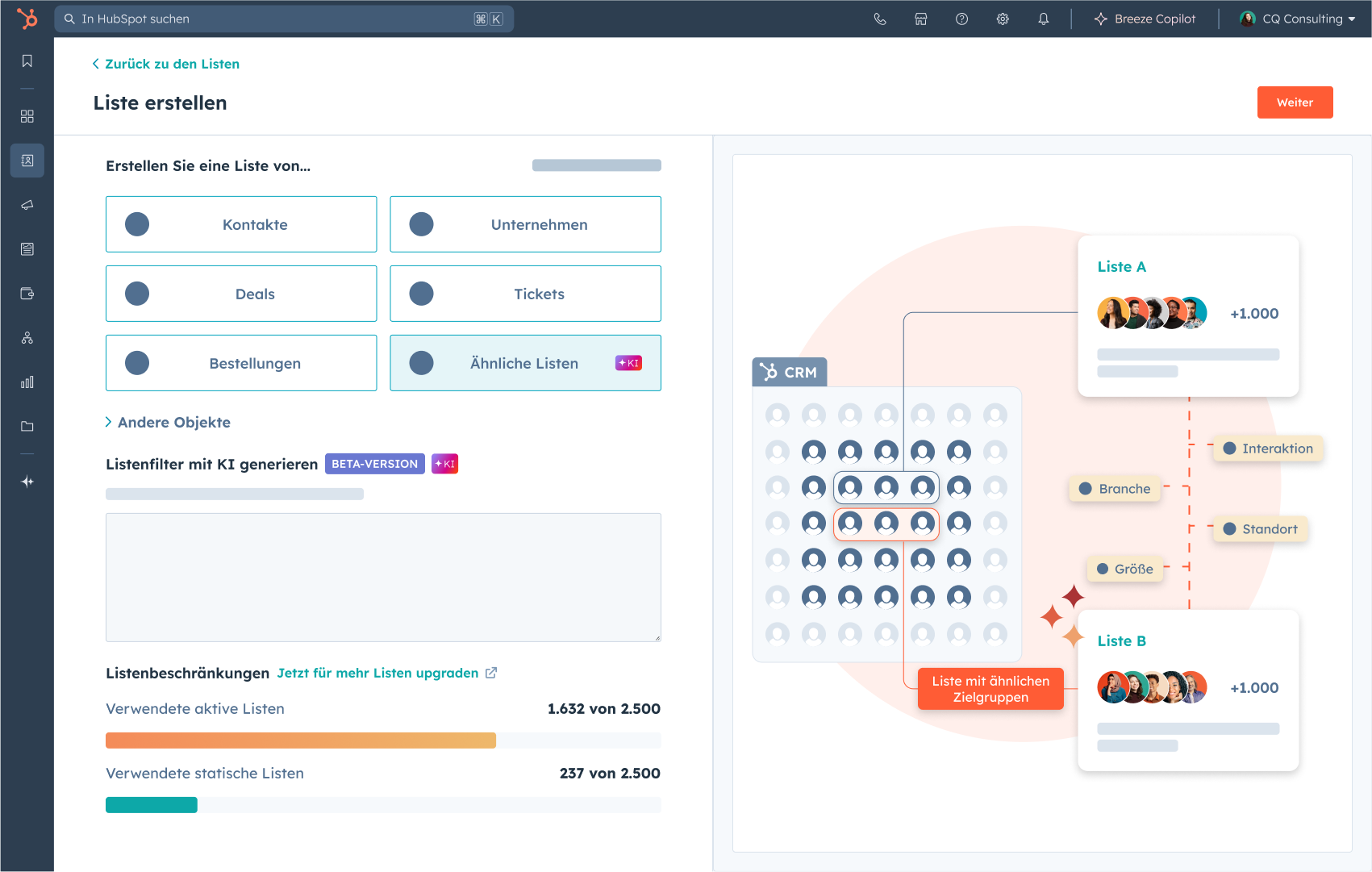 Profi-Tipp: Ihre beste Kundschaft sagt Ihnen, wo Sie noch mehr von ihr finden. Breeze analysiert, was sie einzigartig macht, und findet automatisch weitere Unternehmen, die ähnlich sind. Kein manuelles Filtern, keine Tabellenkalkulationen, sondern intelligentes Targeting auf der Grundlage dessen, was bereits funktioniert.